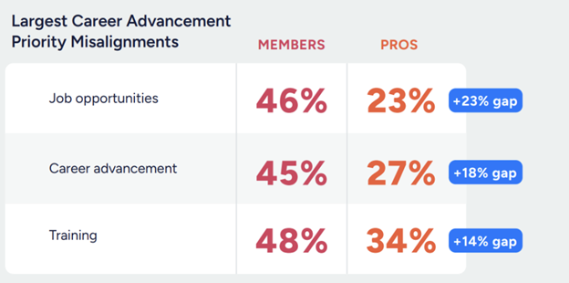 Associations have a knowledge gap that is costing them members. Several years of association trends research show that association members consistently place much higher importance on job opportunities and career advancement than professionals recognize.